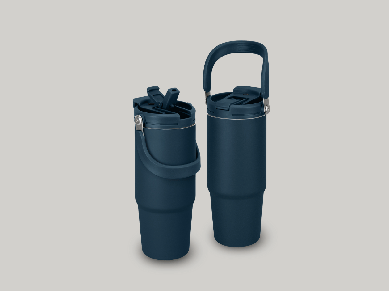 An extra-large 900ml stainless steel vacuum tumbler with a durable powder coated finish and ergonomic carry handle. Designed with double wall insulation and a versatile lid for both straw and flip-top drinking.